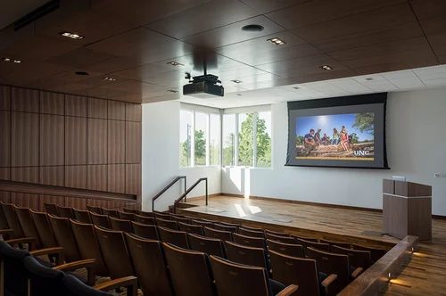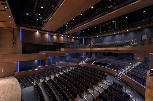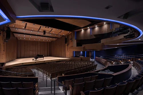 The Concert Hall arrangement and architecture create intimate performance experiences regardless of how many of the 600+ seats are full. The sculpted masses enclose audience spaces and reduce the spaces’ visual volume. Warm and dynamic walnut subtly introduces warmth and is accentuated by dramatic architectural lighting to mask required aggressive acoustic shaping of outer walls.